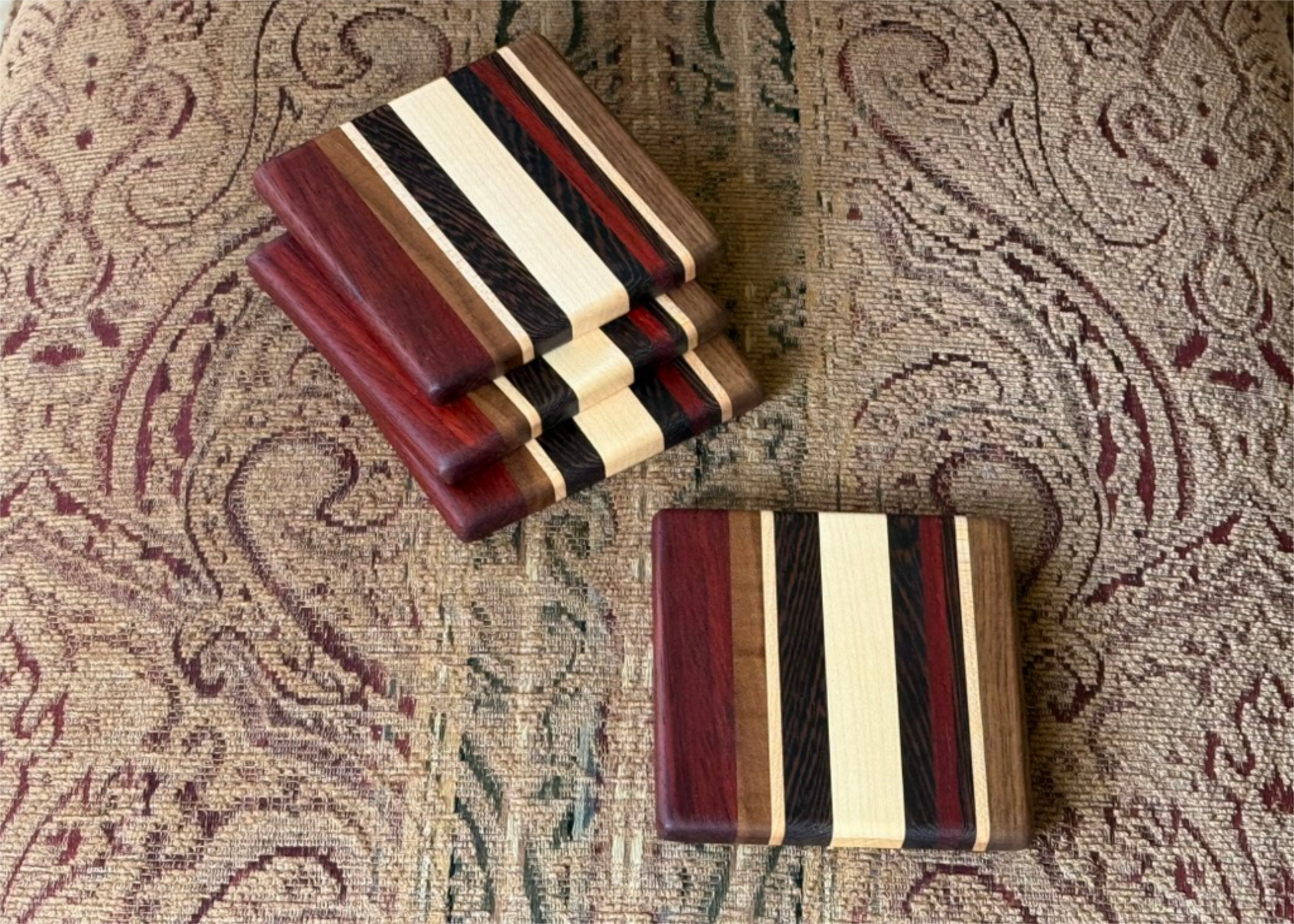 Set of 4 coasters - 4" x 4" x 1/2" thick - Flawless lamination, blending 10 individual strips of Walnut, Maple, Wenge & Padauk