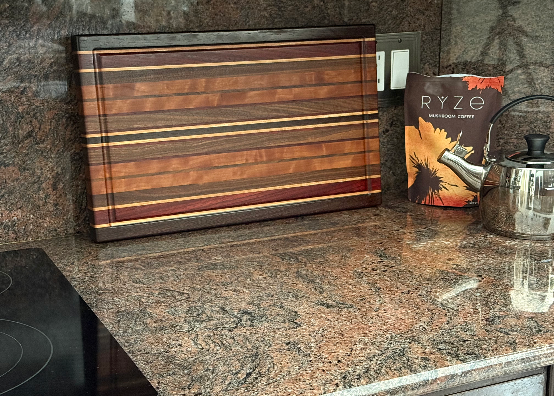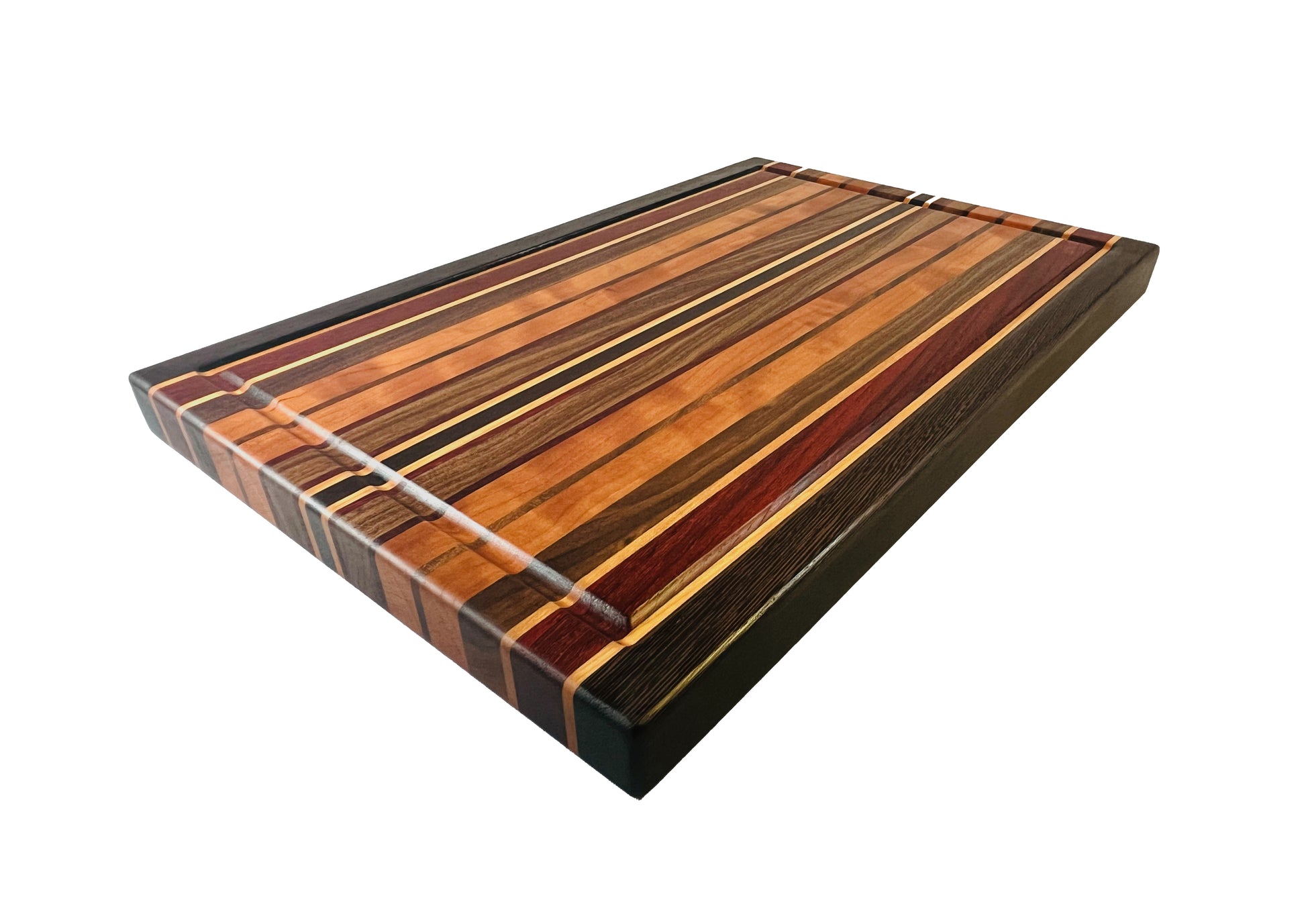 A "Canvas" of hardwood. Flawless lamination, blending 25 individual strips of Walnut, Cherry, Maple, Wenge & Padauk, provides this edge grain board its unique characteristics.