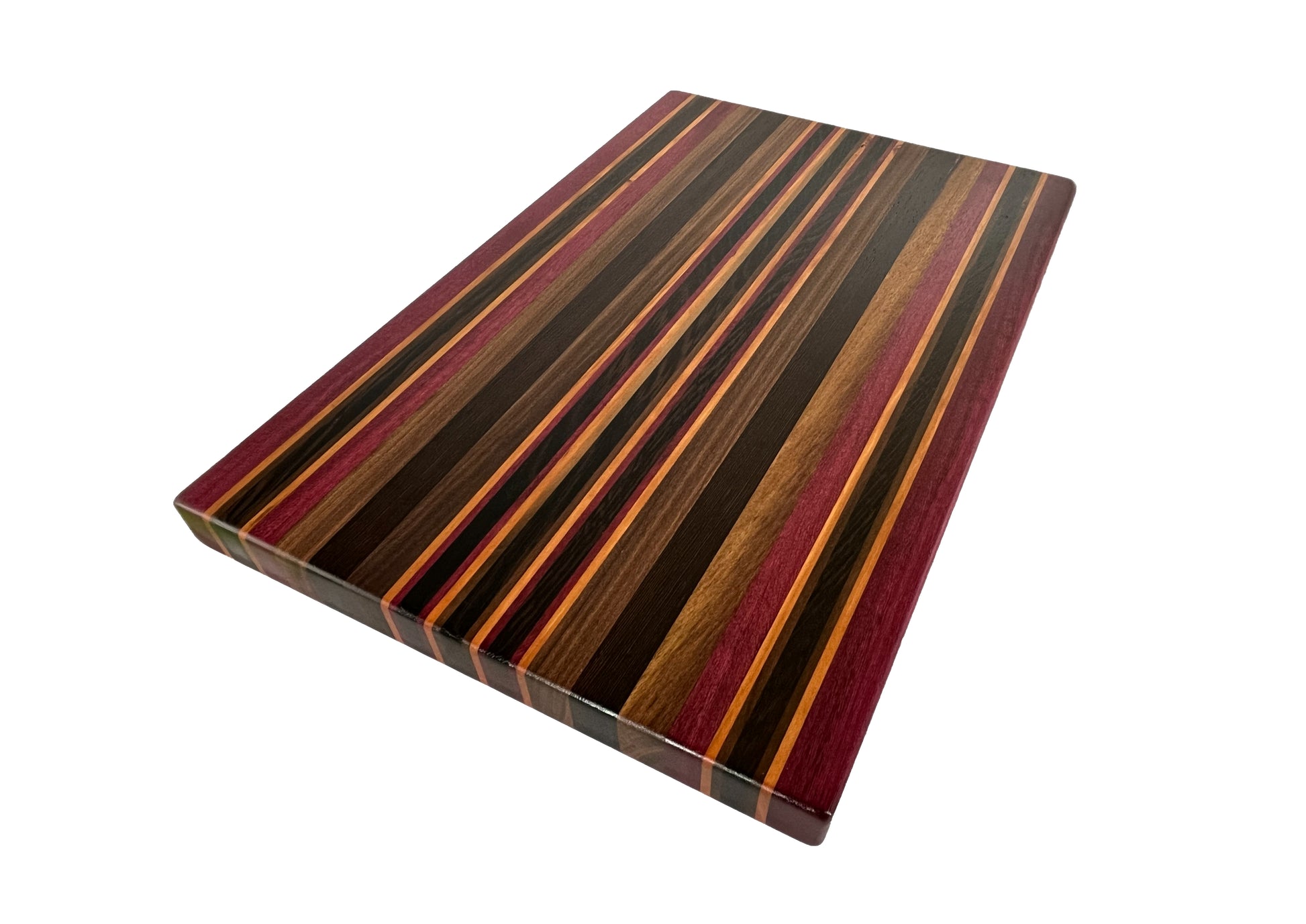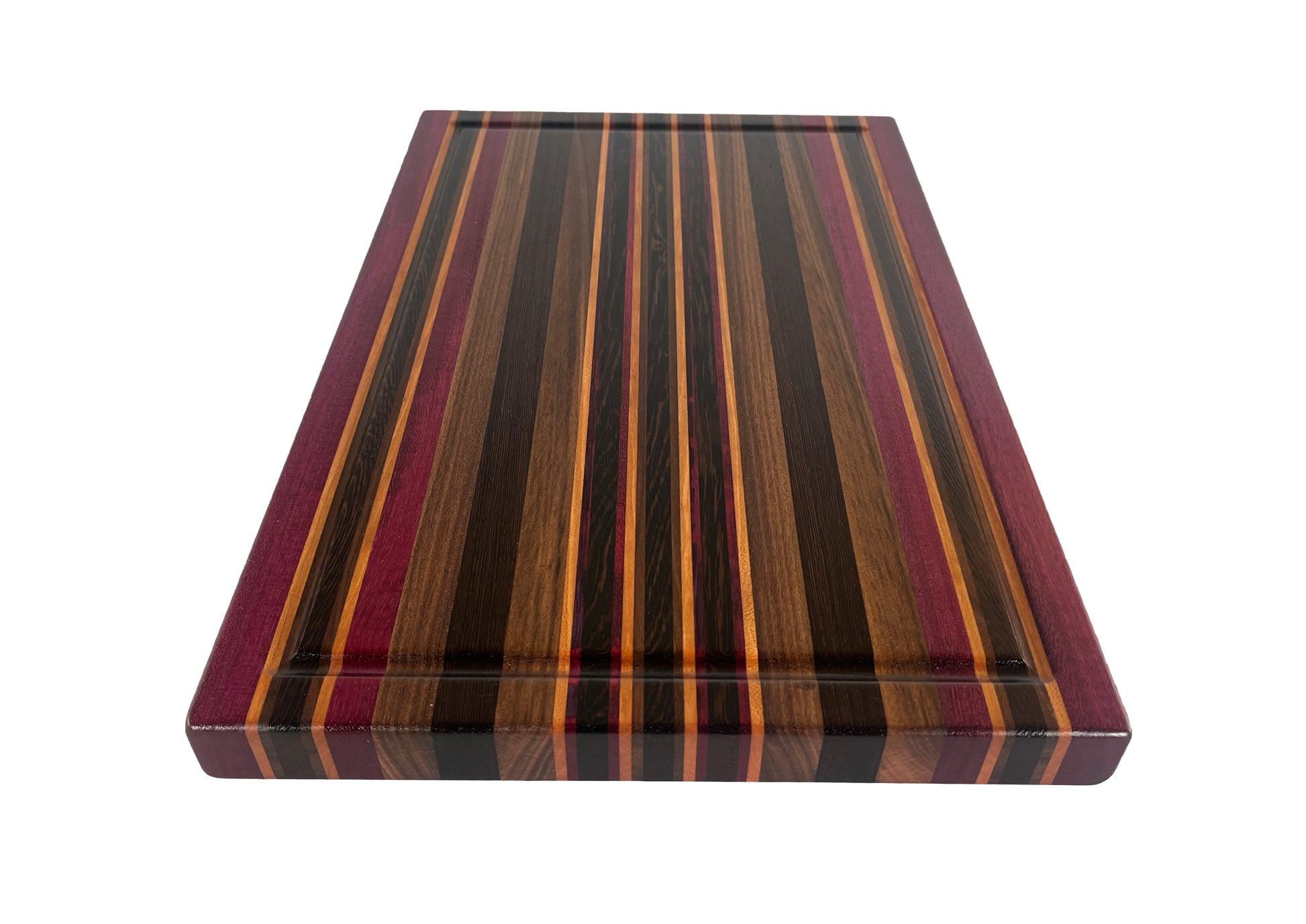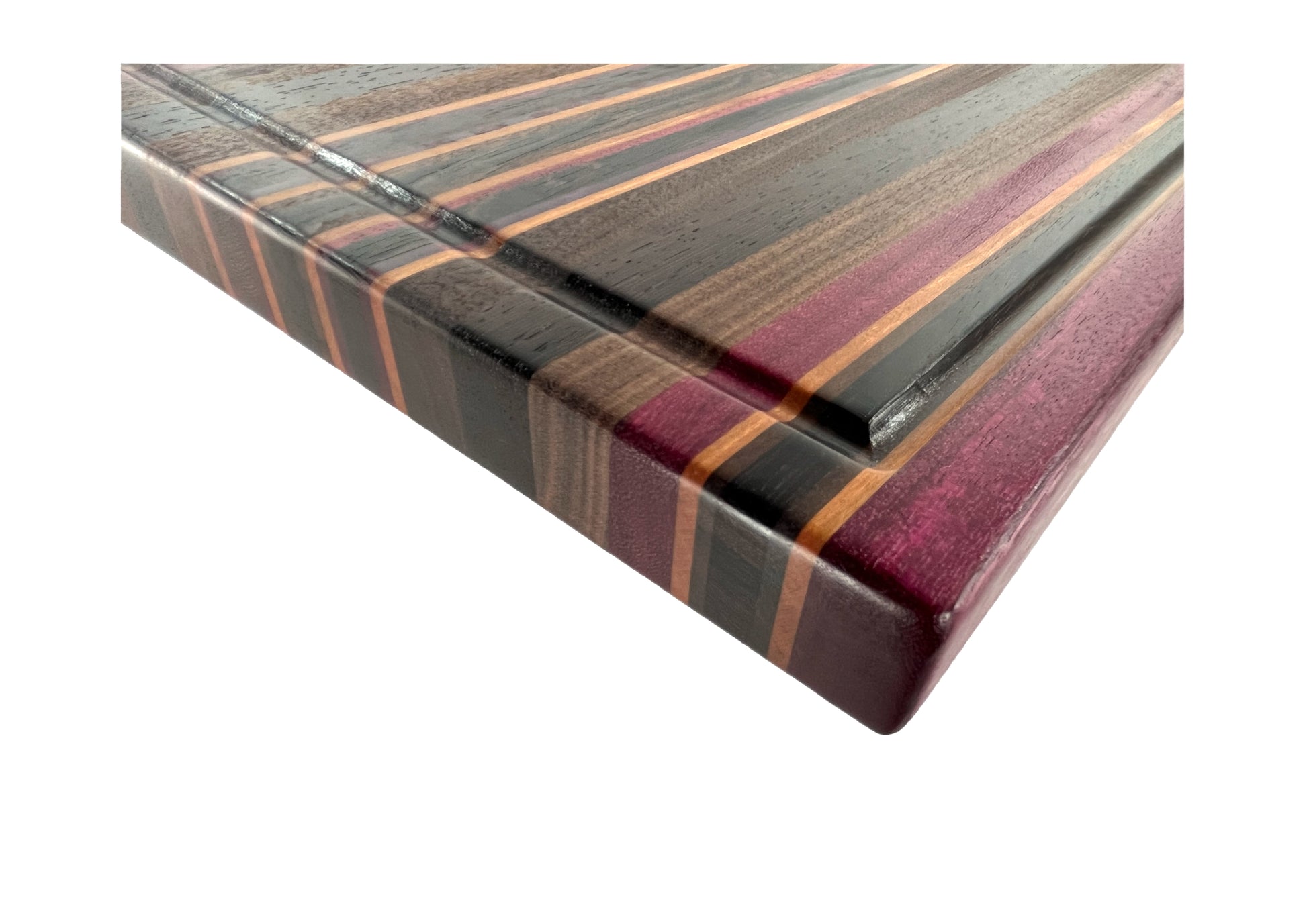 A "Canvas" of hardwood. Flawless lamination, blending 33 individual strips of Walnut, Cherry, Wenge & Purple Heart, provides this edge grain board its unique characteristics.