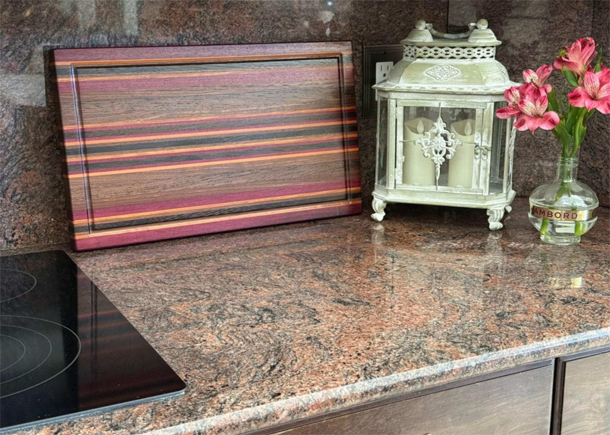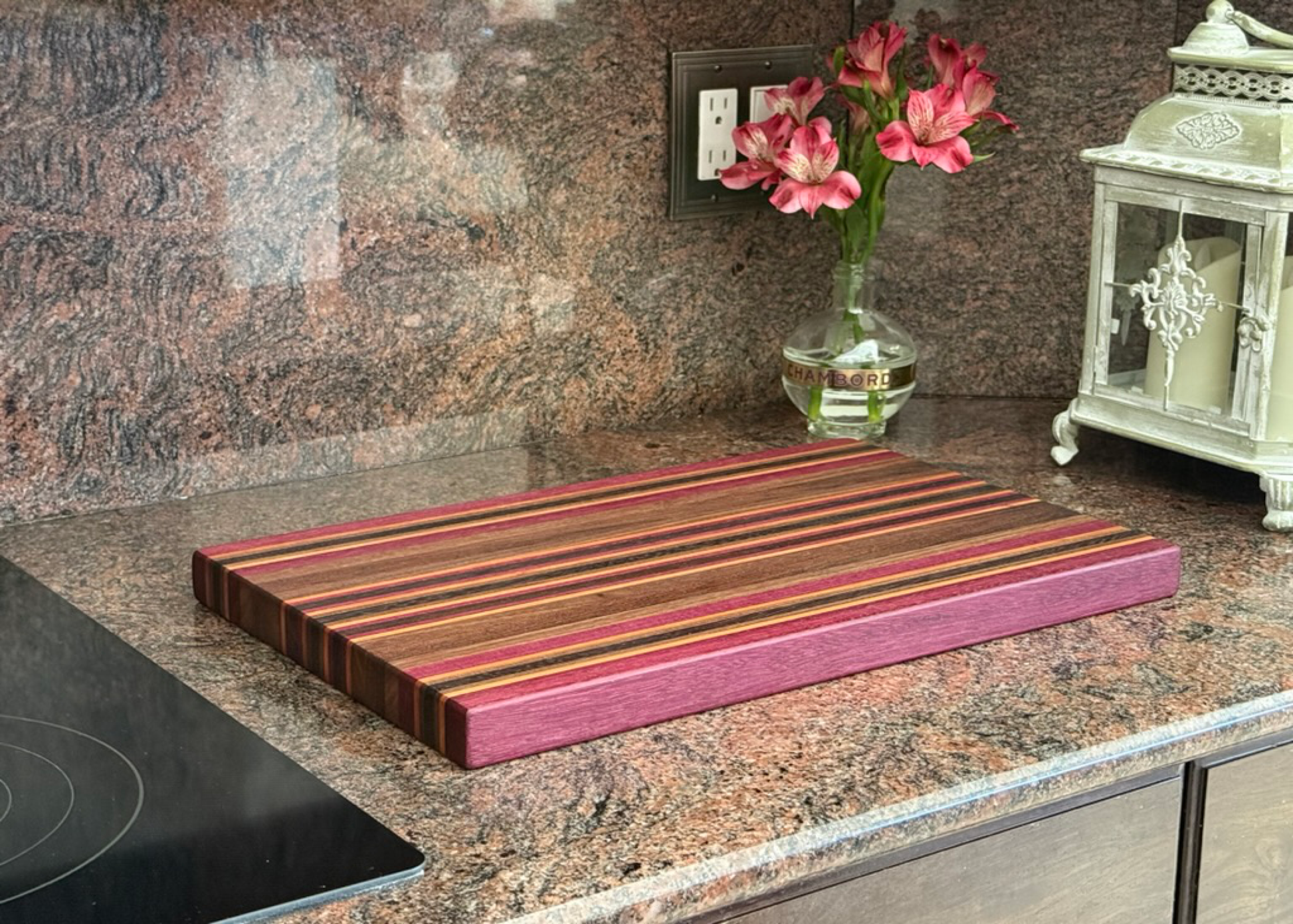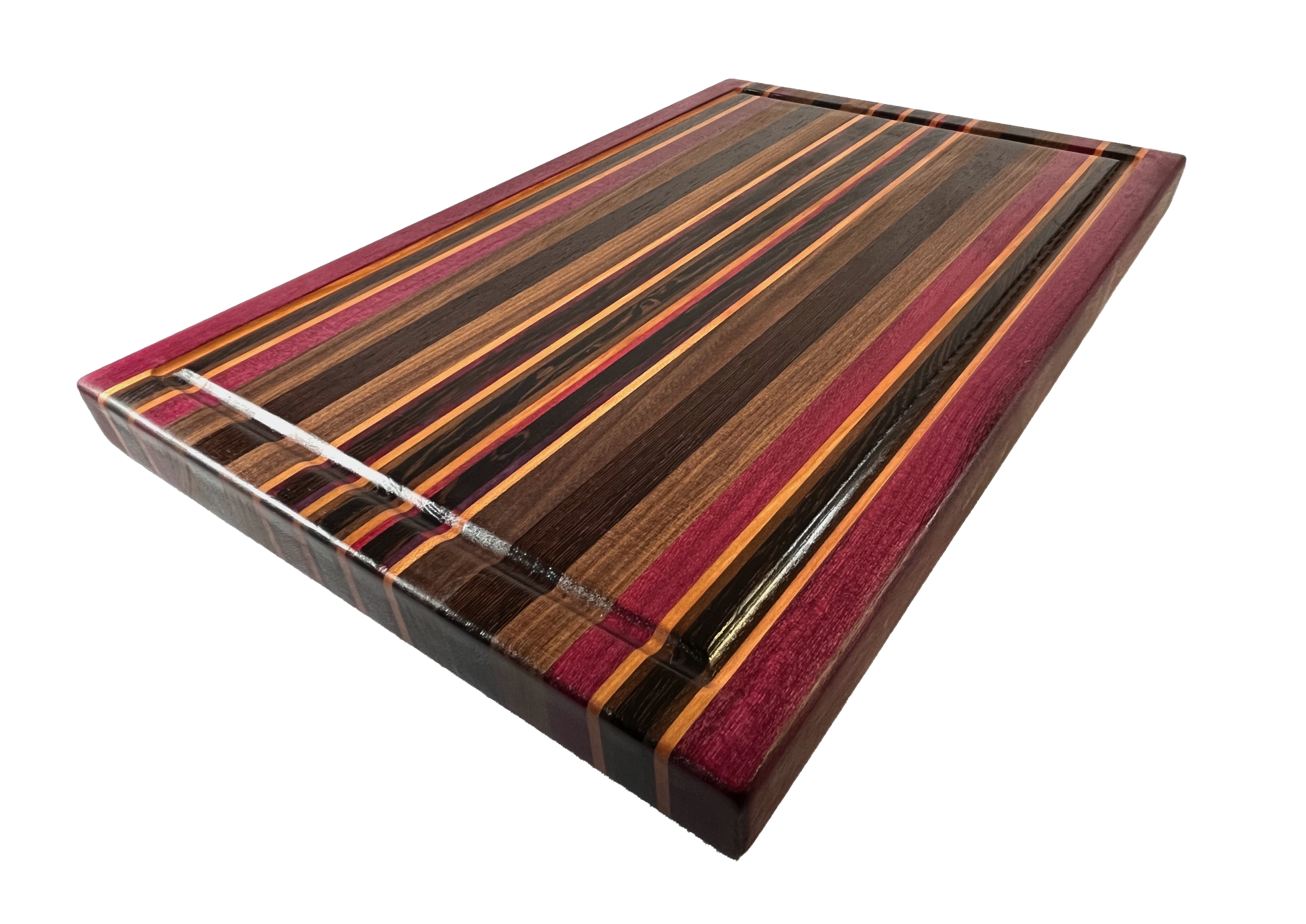 A "Canvas" of hardwood. Flawless lamination, blending 33 individual strips of Walnut, Cherry, Wenge & Purple Heart, provides this edge grain board its unique characteristics.