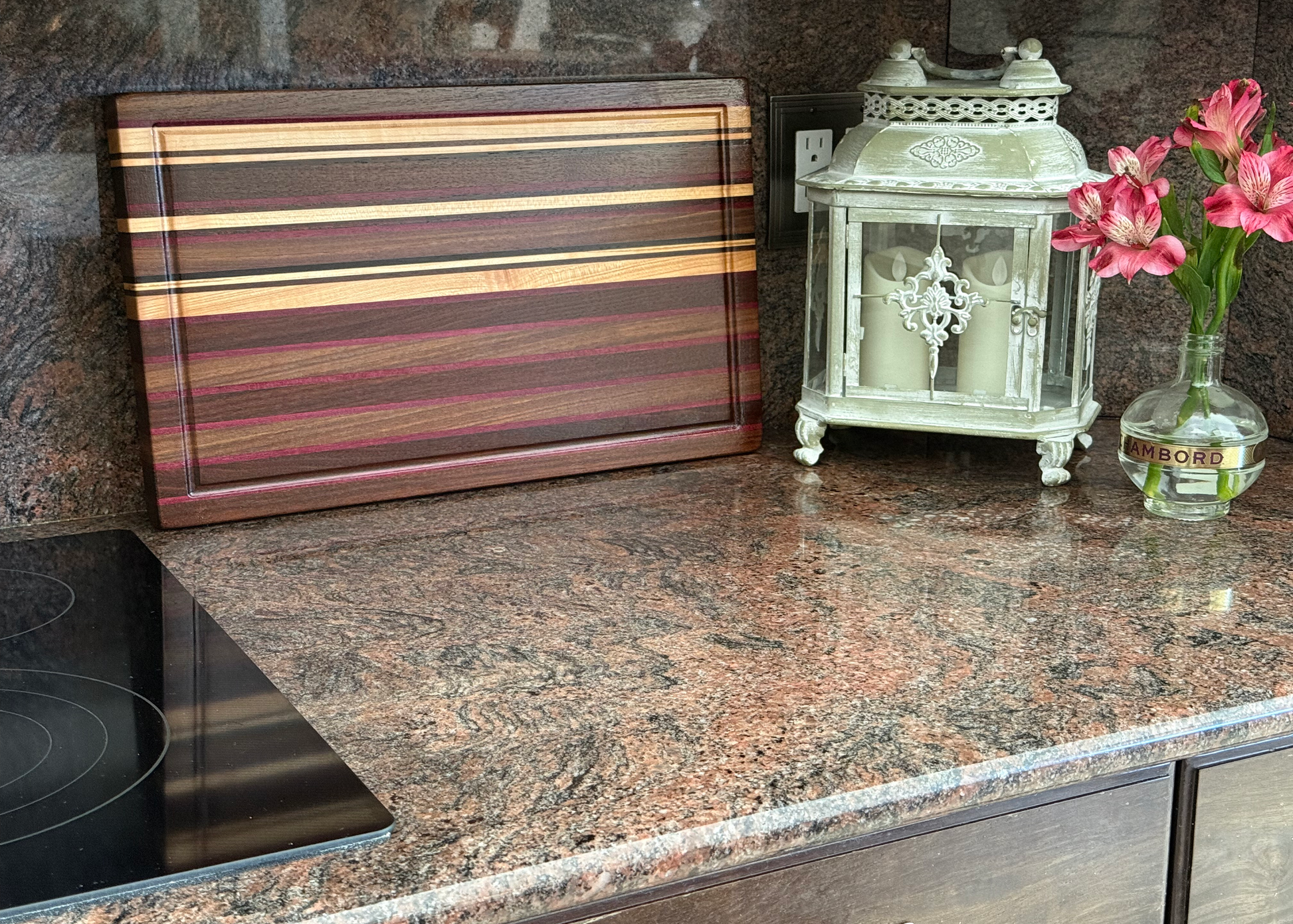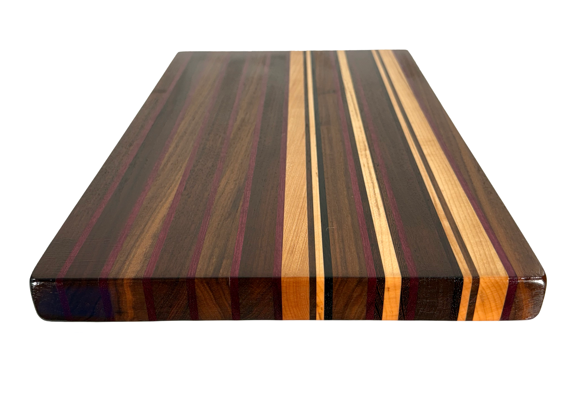 A "Canvas" of hardwood. Flawless lamination, blending 29 individual strips of Walnut, Maple, Wenge & Purple Heart, provides this edge grain board its unique characteristics.